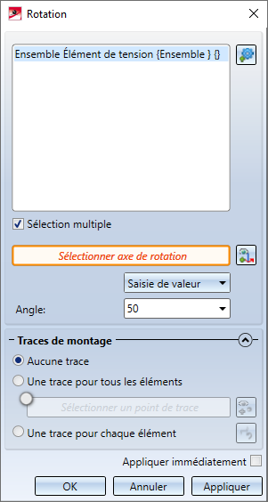 L'angle de rotation peut être déterminé en sélectionnant un point, en saisissant une valeur ou en sélectionnant deux points. Si nécessaire, choisissez le type de rotation souhaité avant de déterminer l'angle. Si le champ Sélectionner axe de rotation est surligné par un cadre orange, vous pouvez déterminer l'axe immédiatement. Si ce n'est pas le cas, cliquez sur le symbole
