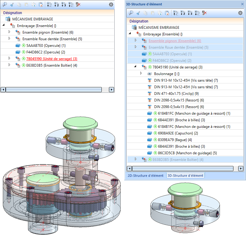 L'illustration suivante montre à gauche un mécanisme d'embrayage. Dans cet exemple, nous voulons créer une vue éclatée de l'ensemble représenté à droite qui porte le nom d'Unité de serrage.