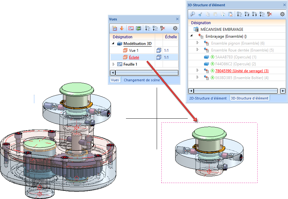 - En premier lieu, une nouvelle vue est créée pour le mécanisme d'embrayage, par exemple une vue avec le nom Éclaté.