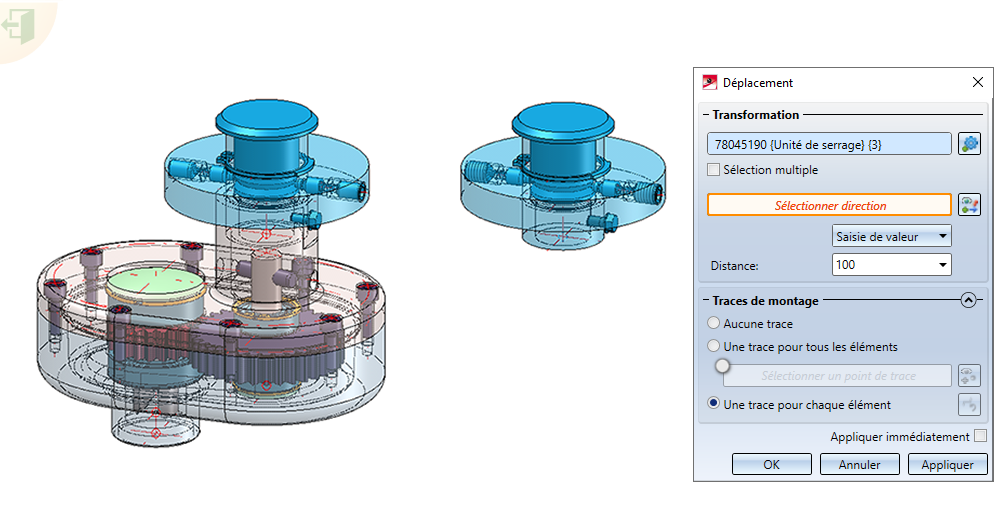 - La représentation en éclaté doit, dans notre exemple, comporter des traces de montage, cocher donc également la case Une trace pour chaque élément.