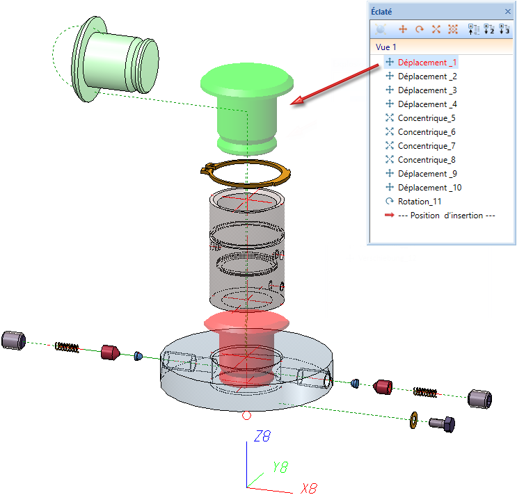 , sélectionner dans l'ICN le Capuchon (1). Le déplacement sera effectué par Saisie de valeur à une distance de 140. Comme direction, choisir l'Axe Z (clic droit). Après un clic sur Appliquer, le déplacement est pris en compte.