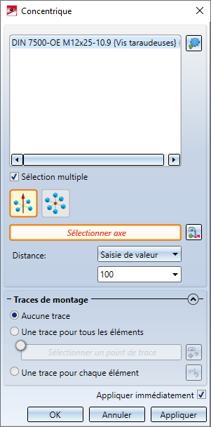 Si vous avez sélectionné l'option Concentrique autour d'un axe, HiCAD détermine automatiquement un cercle qui est concentrique au cercle passant par les centres de gravité des éléments sélectionnés. Vous pouvez agrandir ou réduire dynamiquement le cercle, en déplaçant les éléments au cours du processus. La distance sera déterminée en spécifiant un point.