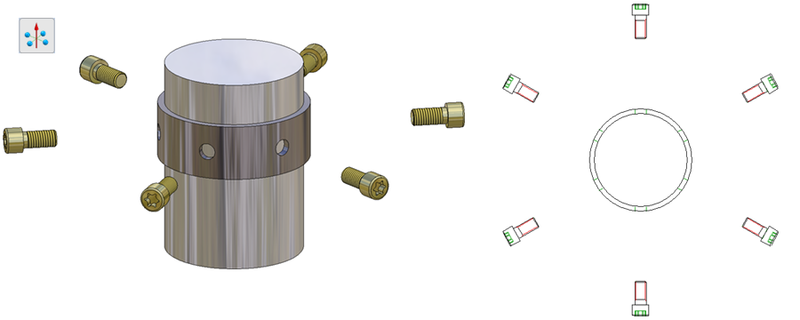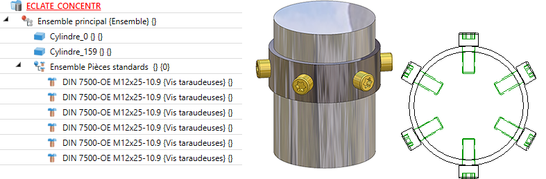 L'illustration suivante montre une vue en éclaté avec déplacement concentrique des vis. Ici, ce sont les vis individuellement qui ont été sélectionnées - et nont l'ensemble regroupant les pièces standardisées. C'est l'option Concentrique autour d'un axe qui a été spécifié et comme axe, c'est l'axe du milieu du cylindre. Si l'on avait ici sélectionné l'ensemble Pièces standards, la fonction n'aurait eu aucun effet.