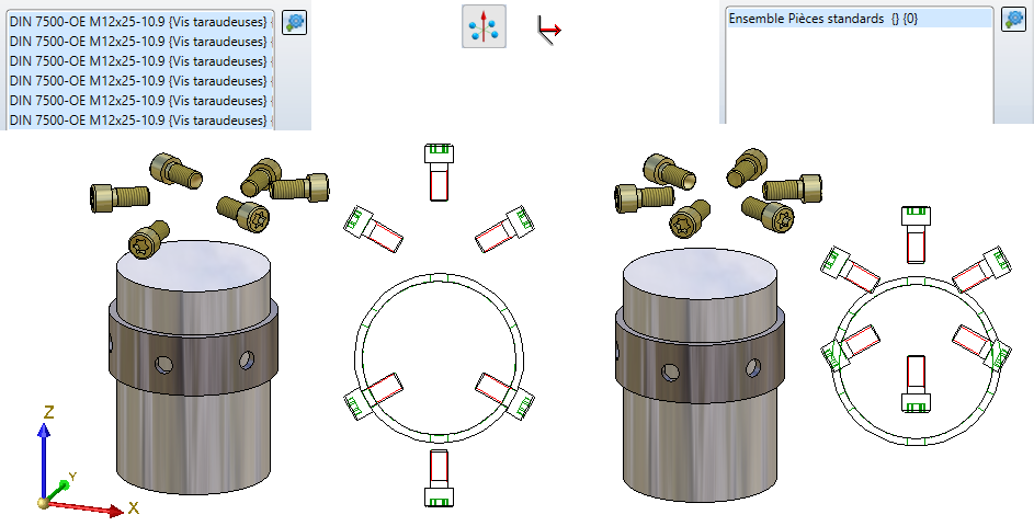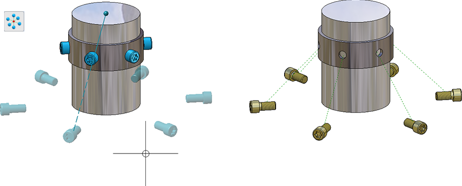 À l'aide de cette fonction, il est possible de définir dans le mode Éclaté des déplacements concentriques dans les vues en éclaté. Cela peut être utile si, par exemple, vous souhaitez transformer des éléments disposés concentriquement autour d'un centre commun, par exemple des boulons disposés sur une grille polaire ou radiale.