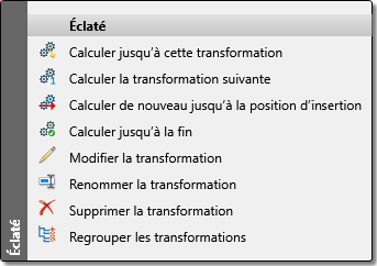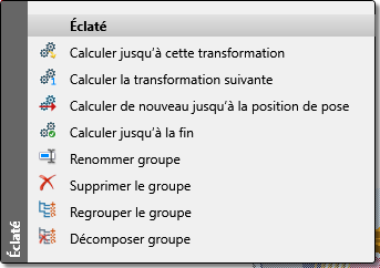 À l'aide de ces fonctions du menu, vous pouvez calculer par étapes ou complètement l'éclaté (par exemple, après modifications de la modélisation d'origine), regrouper des étapes de l'éclaté et modifier des transformations.