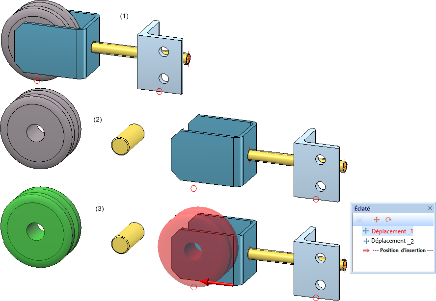 (1) Vue d'origine, (2) Vue éclatée, (3) Déplacement surligné dans la vue éclatée