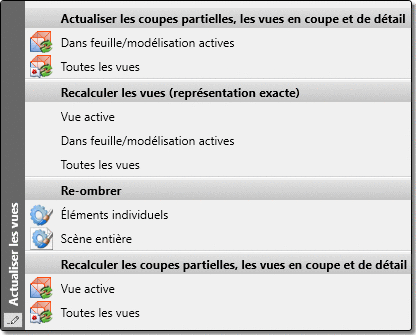 À l'aide des fonctions sous Recalculer les vues (représentation exacte), vous reconvertissez les vues en représentation rapide à la représentation exacte. Cela peut être appliqué à la vue active, à toutes les vues dans la zone de modélisation/de feuille ou à toutes les vues de la scène.