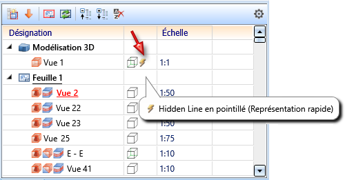 Si, dans une représentation rapide, le type de représentation actuel est à nouveau sélectionné dans la barre d'outils transparente, la vue peut être reconvertie à la représentation exacte. Par exemple, si une vue avec le type de représentation Hidden Line en pointillé est en représentation rapide et que l'utilisateur clique à nouveau sur le symbole