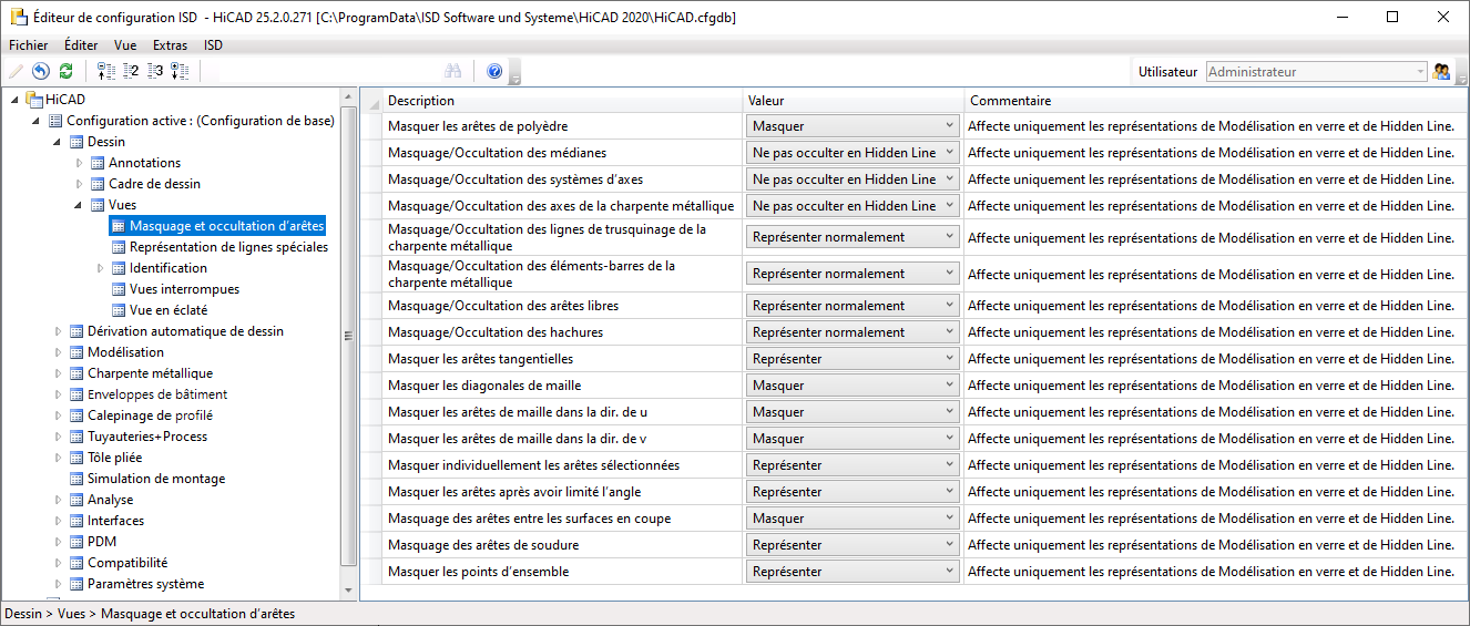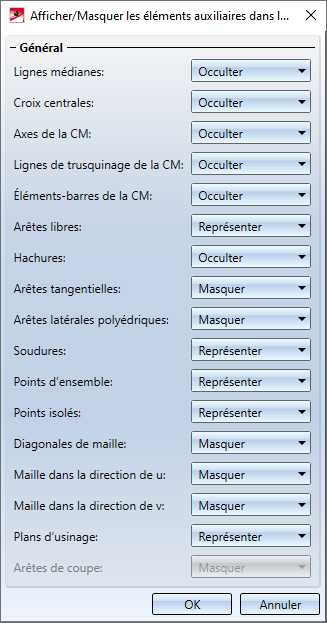 - Les paramètres prédéfinis de cette fenêtre de dialogue peuvent être modifiés dans le Gestionnaire de Configuration, et ce sous Dessin > Vues > Masquage et occultation d'arêtes.