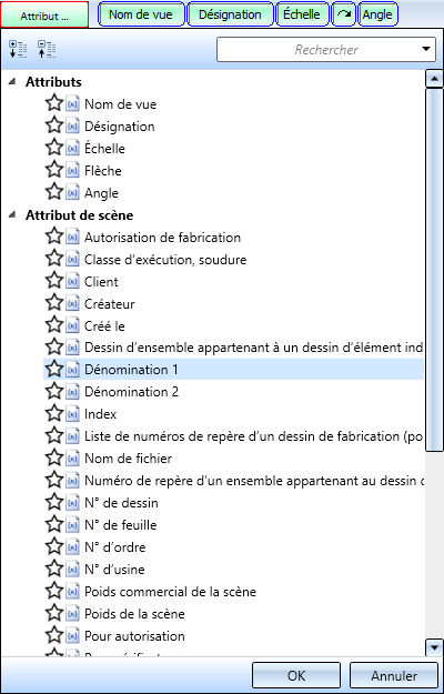 Via le bouton Attribut ..., vous pouvez reprendre les attributs de scène, de projet et de fiche de document. Puisque les vues en coupe et de détail n'appartiennent pas à un élément proprement dit, les attributs d'élément et de fiche d'article ne seront pas pris en charge ici.