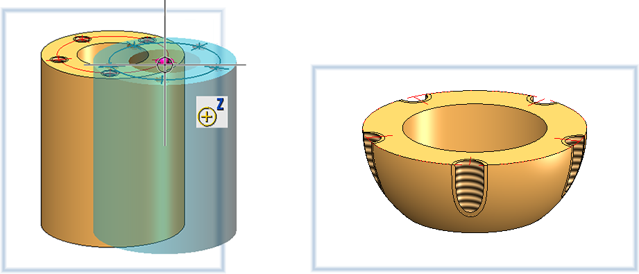 Observons à nouveau l'exemple illustré ci-dessus. Souvenez-vous, le point médian du parallélépipède de détail a été posé à l'aide de l'option de point Z au centre du côté supérieur du cylindre. Maintenant nous déplaçons le cylindre vers la droite.