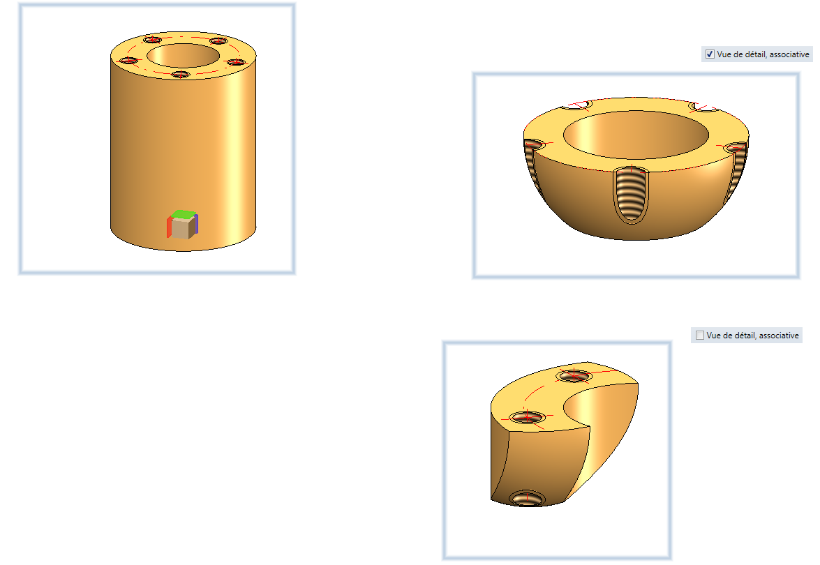 À l'aide de cette fonction, vous pouvez définir des vues de détail. La coupe en détail ne sera pas ici déterminée par une esquisse, mais en définissant un parallélépipède ou une sphère.