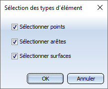 Vous déterminez ici quels éléments - points, arêtes ou surfaces - vous voulez autoriser pour déterminer les points d'attache des cotes. Modifiez au besoin les paramètres, puis quittez la fenêtre par OK. En quittant cette fenêtre par Annuler, cela met un terme à la fonction de cotation !