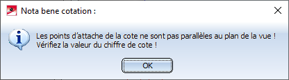 - Lors de la cotation des angles, si les pieds d'attache de cote déterminés par les côtés identifiés ne sont pas parallèles au plan de vue actuel, le message suivant s'affiche :