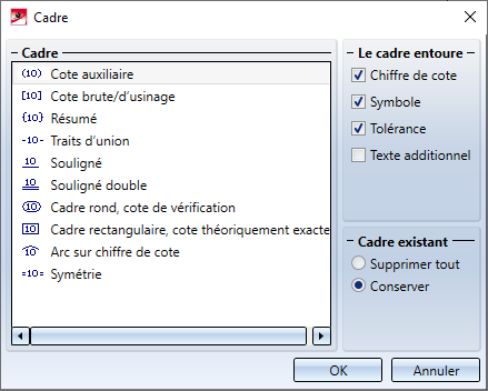 Sélectionnez le cadre ou les parenthèses et déterminez quels éléments de la cote le cadre/les parenthèses doivent entourer. Sous Cadre existant, vous spécifiez le traitement du cadre qui existe déjà dans une cote.