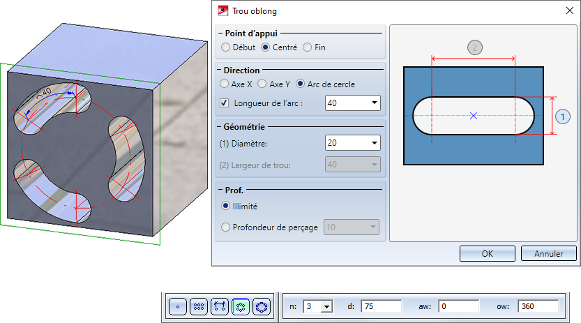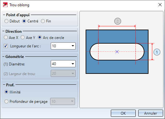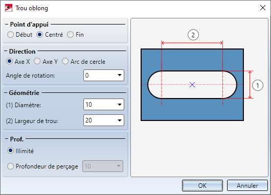 1. Après le lancement de la fonction, et selon les paramètres sélectionnées pour les étapes nécessaires du dialogue, la fenêtre de dialogue Trou oblong s'affiche.