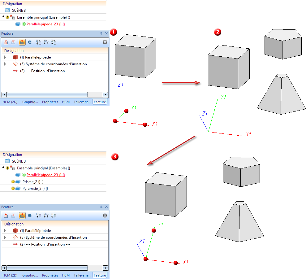 Exemple : (1) Insertion d'un élément référencé, (2) Insertion d'autres éléments et définition d'un système de coordonnées local, (3) Suppression du référencement et nouveau référencement de l'élément