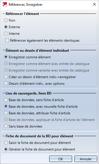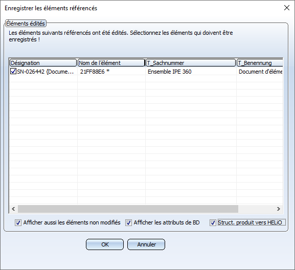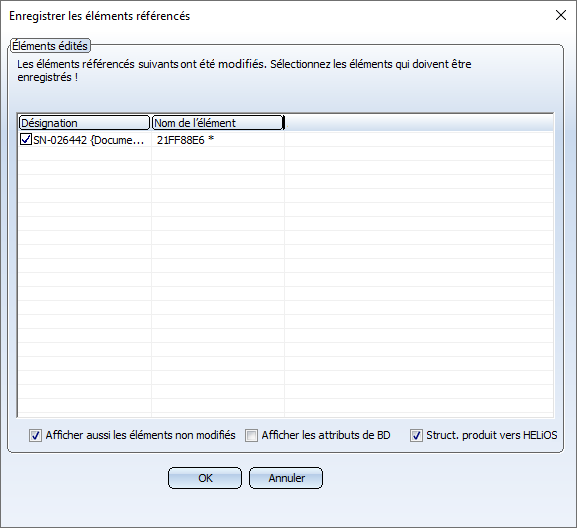 Si une scène contient des éléments référencés avec fiche d'article et/ou de document, en enregistrant la scène, HiCAD vérifiera si l'élément a été modifié depuis le dernier enregistrement. Si c'est le cas, apparaîtra alors, comme en travaillant sans HELiOS, la fenêtre Enregistrer les éléments référencés.