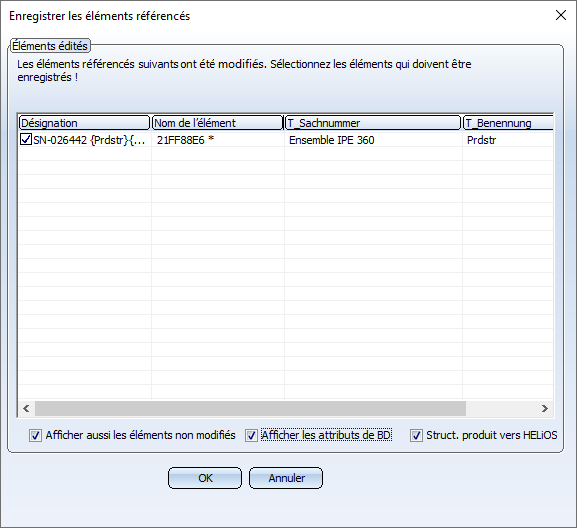 Si la case est cochée, s'afficheront alors en haut dans la liste des éléments, à côté de la désignation et du nom de l'élément, les attributs d'élément HELiOS T_Sachnummer (Numéro ID) et T_Benennung (Dénomination).