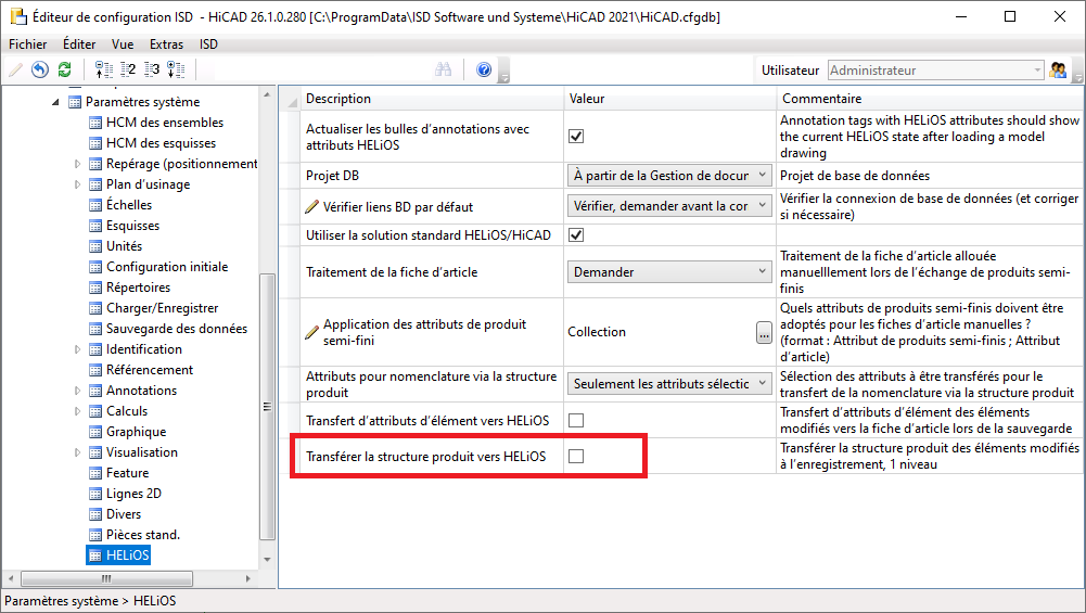 Veuillez prendre également connaissance de la remarque ci-dessous concernant le paramètre de l'Éditeur de Configuration appelé Transférer la structure produit vers HELiOS.