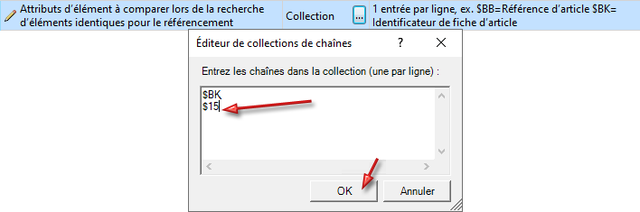 - Les attributs d'élément concordent. Les attributs qui seront alors pris en compte sont spécifiés dans le Gestionnaire de Configuration sous Paramètres système > Référencement. Vous avez là la possibilité, sous Attributs d'élément à comparer lors de la recherche d'éléments identiques pour le référencement de créer une liste des attributs à comparer. Par défaut, il s'agit ici de l'id. de fiche d'article $BK.