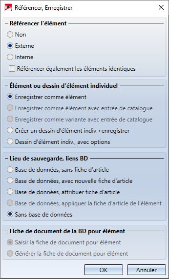 Enregistrer comme élément). Lancez ensuite pour cet élément à nouveau la fonction Référencer l'élément, Enregistrer, Dessin d'élément individuel et cochez l'option Enregistrer comme élément / variante avec entrée de catalogue.