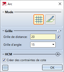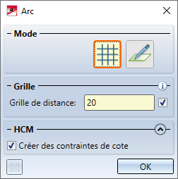 L'arc est ajouté immédiatement sur la scène. La fenêtre de dialogue reste ouverte pour pouvoir ajouter d'autres arcs (dans la même esquisse) sur la scène.