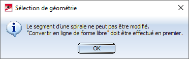 Les spirales paramétrées ne peuvent pas être modifiées via les fonctions d'usinage de HiCAD. Si cela est tenté, le message suivant s'affiche alors :