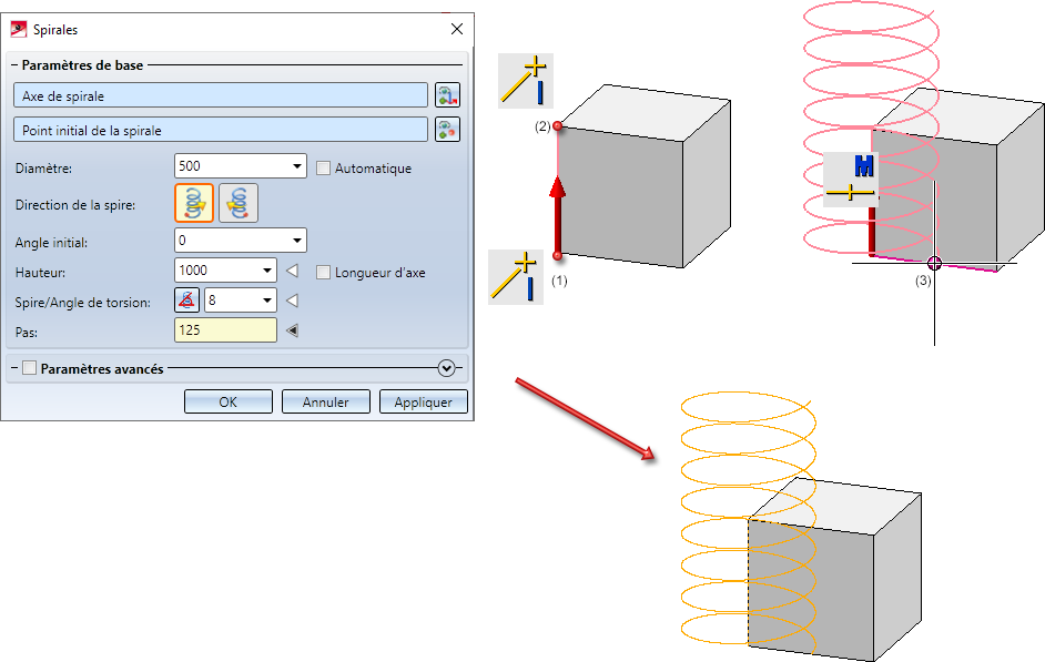 , vous pouvez accéder à la partie basse de la fenêtre (par défaut, cet encart est fermé). Vous y avez la possibilité, en cochant la case Paramètres avancés, de définir d'autres paramètres. À titre d'exemple, vous pouvez choisir entre une forme de spirale cylindrique ou conique et spécifier un tracé différent au début et à la fin de la spirale.