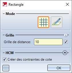 Le rectangle est ajouté immédiatement sur la scène. La fenêtre de dialogue reste ouverte pour pouvoir ajouter d'autres rectangles (dans la même esquisse) sur la scène.