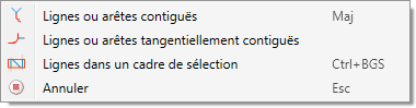 Identifiez, après avoir lancé la fonction, la ligne/arête de votre choix ou utilisez les fonctions du menu contextuel de sélection. Vous accédez à ce menu pendant le processus de sélection par un clic droit de la souris.