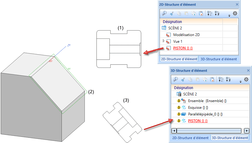 (1) Élément 2D, (2) Plan d'usinage actif, (3) Esquisse obtenue