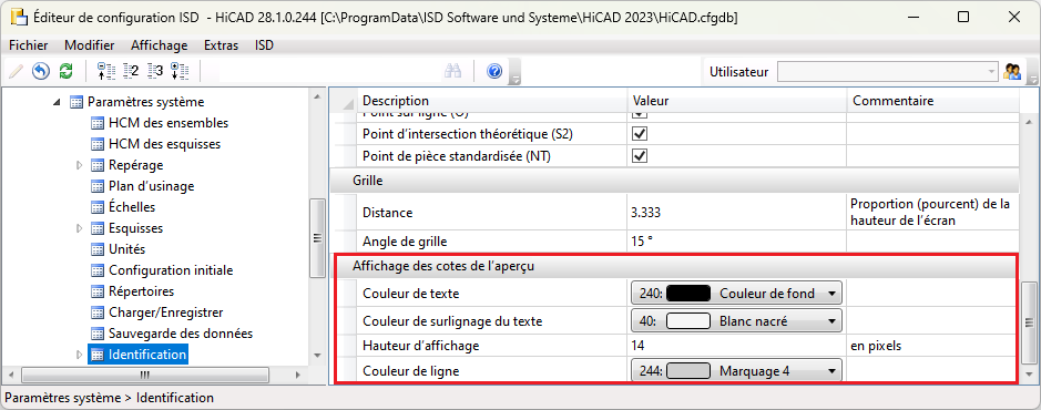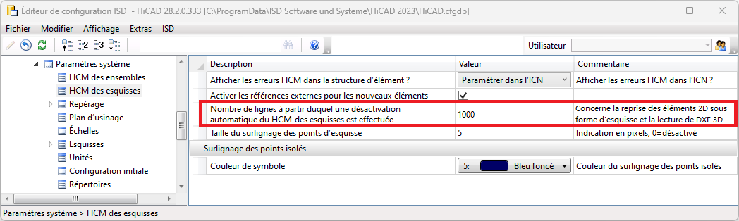 La taille et la couleur du surlignage sont spécifiées dans le Gestionnaire de Configuration sous Paramètres système > HCM des esquisses.