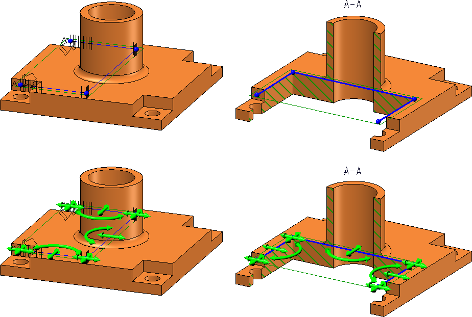 - Dans les coupes partielles, les vues en coupe et de détail, l'esquisse est coupée.