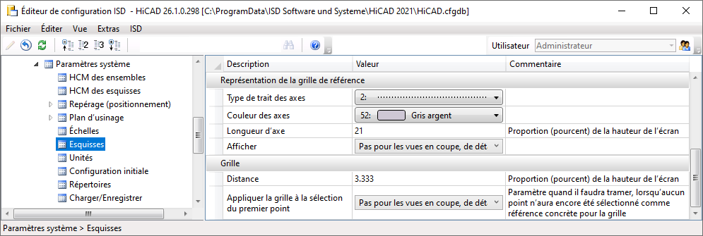 La représentation de la grille de référence, pour créer des esquisses et des esquisses 3D avec l'outil d'esquisse, peut être paramétrée dans le Gestionnaire de Configuration sous Paramètres système > Esquisses dans l'encart de la fenêtre appelé Représentation de la grille de référence.
