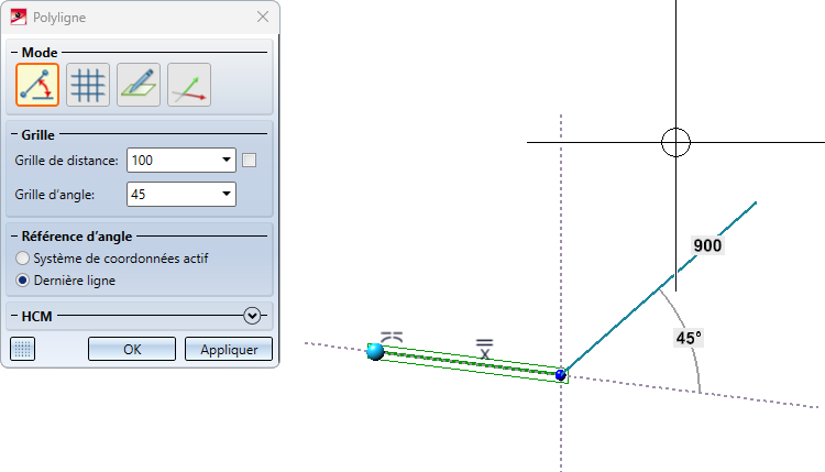 - Au moment d'esquisser des polylignes, des cercles, des arcs et des ellipses, les contraintes HCM correspondantes peuvent également être créées automatiquement. Les éléments auxiliaires individuels de la polyligne sont alors reliés entre eux automatiquement par des contraintes de cote et de position. Vous pouvez activer cet automatisme directement dans la boîte de dialogue pendant le dessin des éléments de l'esquisse.