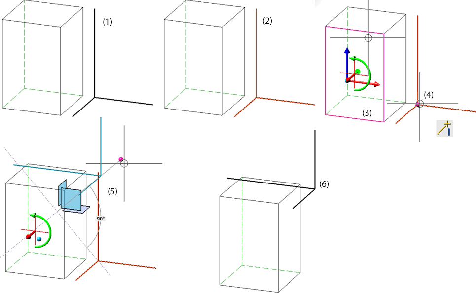 (1) Esquisse 3D, (2) Surlignage des éléments sélectionnés, (3) Sélection d'une surface, (4) Point pour la référence angulaire, (5) Angle de 90°, (6) Résultat sans adapter les lignes contiguës