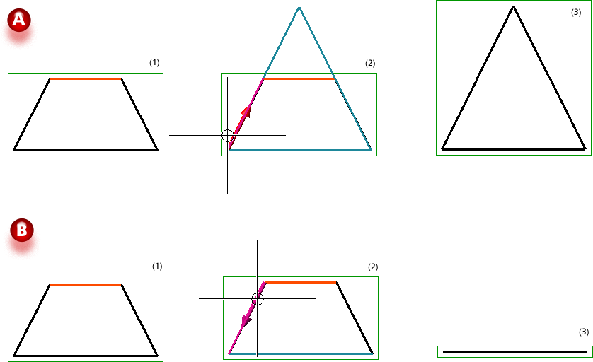 Dans la situation A, la ligne sélectionnée (1) est déplacée dans la direction (2). Cela forme un apex (3) dans laquelle se trouve un segment dégénéré. En supprimant les 3 lignes normales, le segment dégénéré restera en permanence dans le dessin.