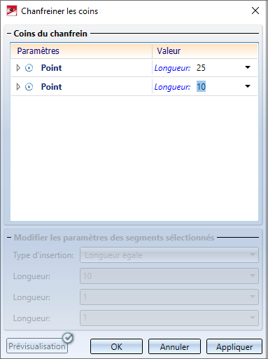 Tous les coins sélectionnés seront chanfreinés par un clic sur OK en fonction des valeurs indiquées sous Modifier les paramètres des segments sélectionnés.