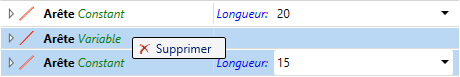 - Pour les arêtes, à côté du type d'élément est indiqué le type d'arrondi : Constant ou Variable.