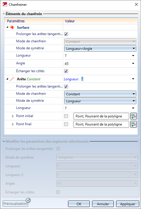 Différents paramètres peuvent être modifiés en une seule fois pour plusieurs éléments chanfreinés. Il s'agit