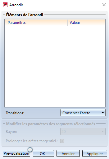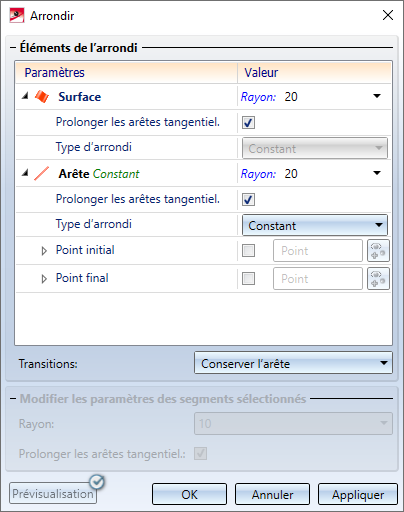 - Dans la partie basse de la fenêtre, vous pouvez avec Transitions influencer la création des surfaces d'arrondi. En outre, sous Modifier les paramètres des segments sélectionnés la possibilité de modifier en une seule fois le rayon et la suite tangentielle des arêtes pour tous les éléments sélectionnés dans la liste.