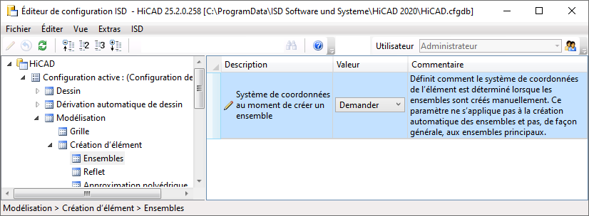 Comme tout élément, un ensemble possède également un système de coordonnées d'élément. Soit HiCAD détermine automatiquement ce système de coordonnées, soit vous définissez ce système au moment de la création de l'ensemble. À cet effet est prévu un paramètre dans le Gestionnaire de Configuration ISD dans Modélisation > Création d'élément > Ensembles.
