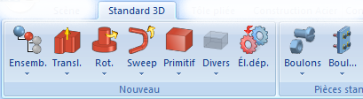 Pour créer de nouveaux éléments 3D, vous trouverez les fonctions correspondantes dans l'onglet Standard 3D, rubrique Nouveau.