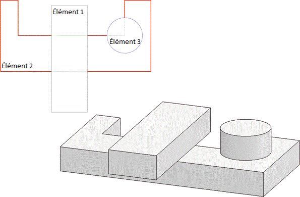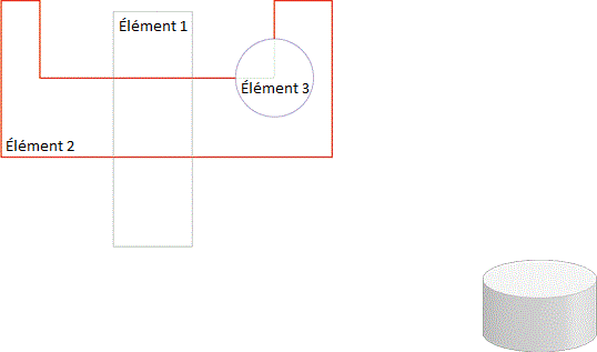 L'illustration ci-dessous présente trois éléments 2D. L'élément 1 (rectangle, niveau 3) et l'élément 3 (niveau 2) occultent l'élément 2 (contour rouge, niveau 1).