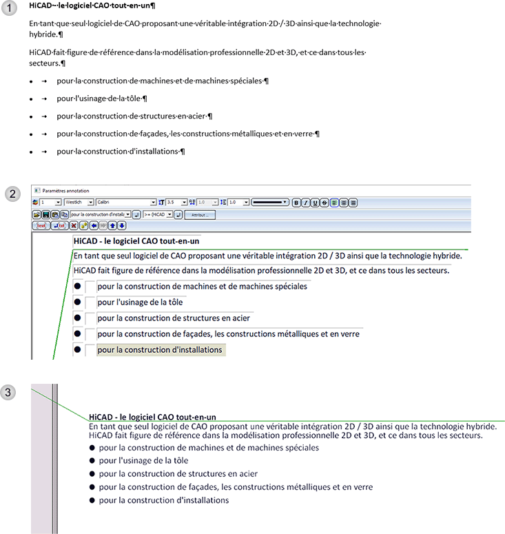 Prenons comme exemple un texte WORD (1) inséré par copier-coller dans l'éditeur d'annotation (2). Les tabulations ont été simulées par des espaces. (3) illustre l'annotation correspondante dans HiCAD.