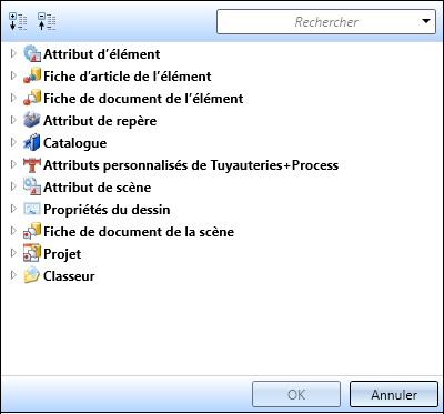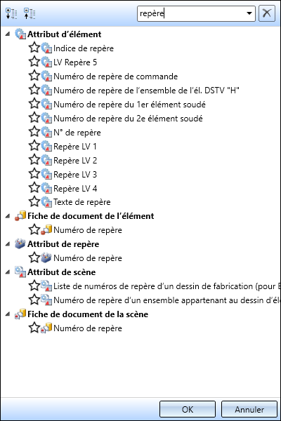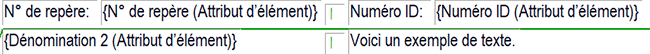 - Si vous souhaitez, lors de l'annotation d'un élément, utiliser les attributs de l'élément supérieur, vous pouvez faire précéder l'attribut de la chaîne de caractères %U. En répétant la lettre U autant de fois, les attributs des éléments qui sont situés autant de fois plus haut dans la structure seront utilisés, par exemple %U{Numéro de repère} ou %UU{Numéro de repère}.
