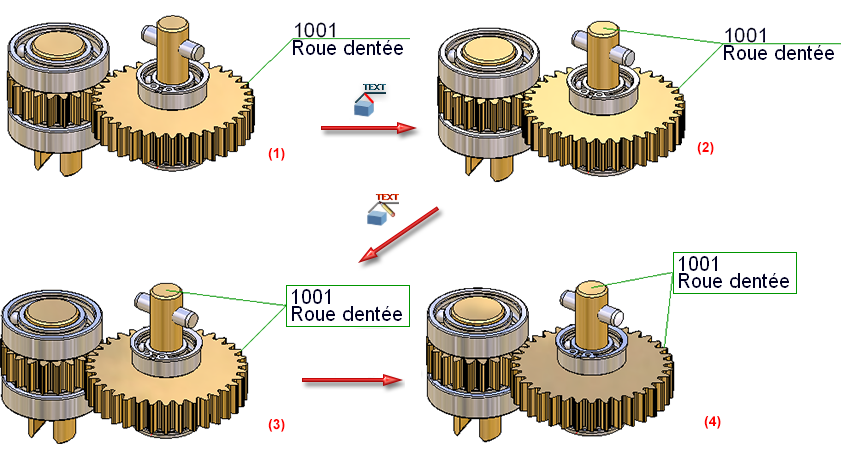 (1) Élément avec annotation ; (2) Annotation avec ligne supplémentaire, Point d'attache est le centre du cadre ; (3) Paramètres d'annotation modifiés ; (4) Déplacement de l'annotation