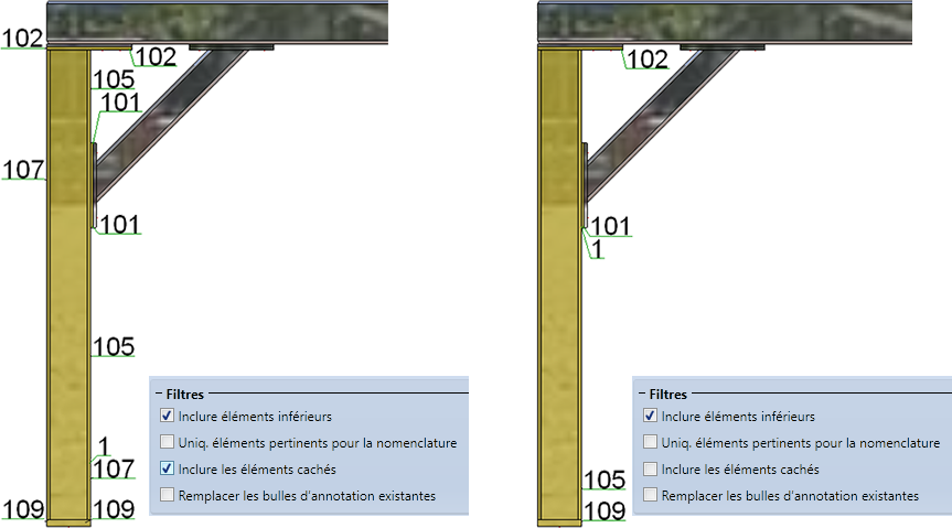 détermine si uniquement les éléments pertinents pour la nomenclature de la sélection ou tous les éléments devront être annotés. - Inclure les éléments cachés