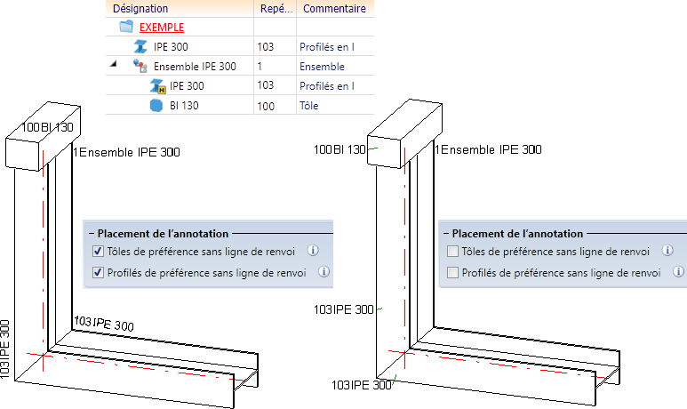 Vous avez ici la possibilité de spécifier si l'annotation des tôles et des profilés devra se faire de préférence sans ligne de renvoi.